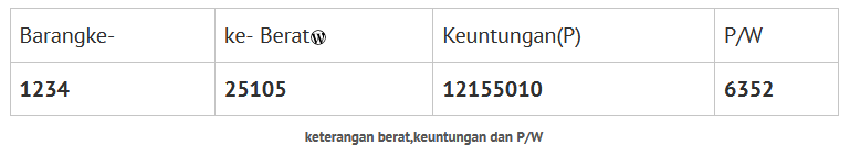 Gerobak yang akan dipakai untuk mengangkut barang-barang tersebut hanya mampu menampuk beban seberat 16 kg. Berikut merupakan tebel penggambaran beratdan keeuntungan yang akan diperoleh untuk tiap penjualan barang tersebut.